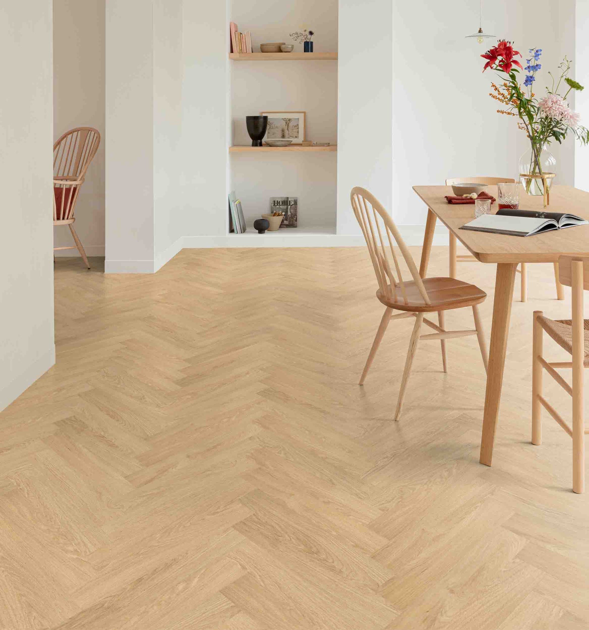 Ontdek de tijdloze elegantie van Floorify F301 Uni, een visgraatvloer geïnspireerd op een elegante premium eik in een populaire lichte natuurtint. Deze vloer voegt een gevoel van verfijning toe aan elk interieur, dankzij de elegante kleur en het klassieke visgraatpatroon. De Uni F301 straalt een natuurlijke charme uit en brengt een gevoel van ruimte en lichtheid in elke ruimte waar het wordt gelegd. Met zijn duurzaamheid en tijdloze uitstraling is deze visgraatvloer niet alleen een esthetische aanwinst voor je huis, maar ook een praktische keuze voor langdurige schoonheid en comfort.