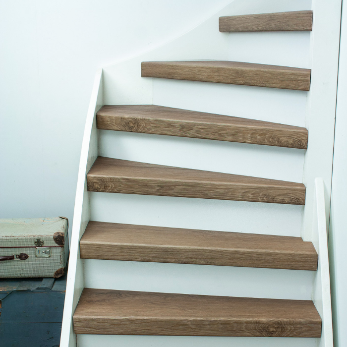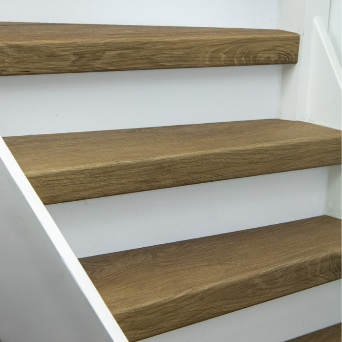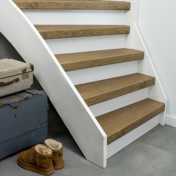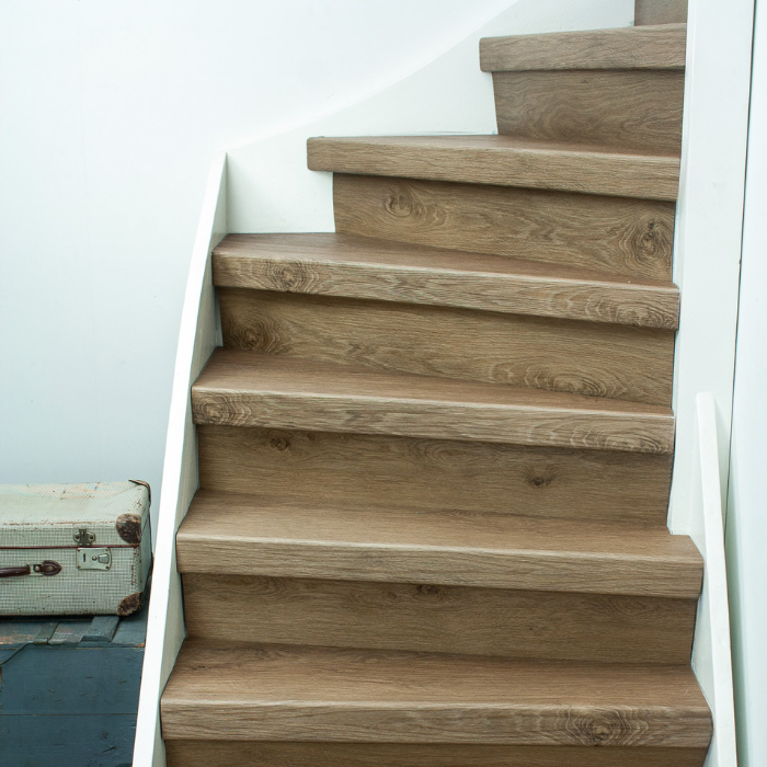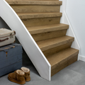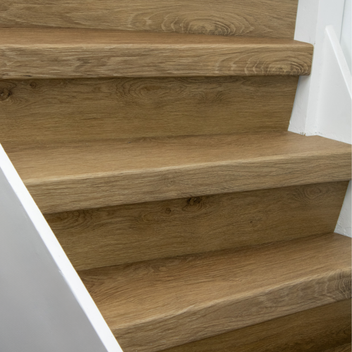 De Rijn PVC-traprenovatie heeft een warme kleur die een rustige uitstraling geeft. De traptreden zijn 8 mm dik en de neuslijsten hebben een hoogte van 70 mm, wat zorgt voor een stijlvolle look. De stootborden zijn verkrijgbaar in het wit, zwart of in de kleur van de vloer. De Rijn PVC-traprenovatie is gemaakt van 100% schoon materiaal en biedt een hoge kras- en slijtvastheid.